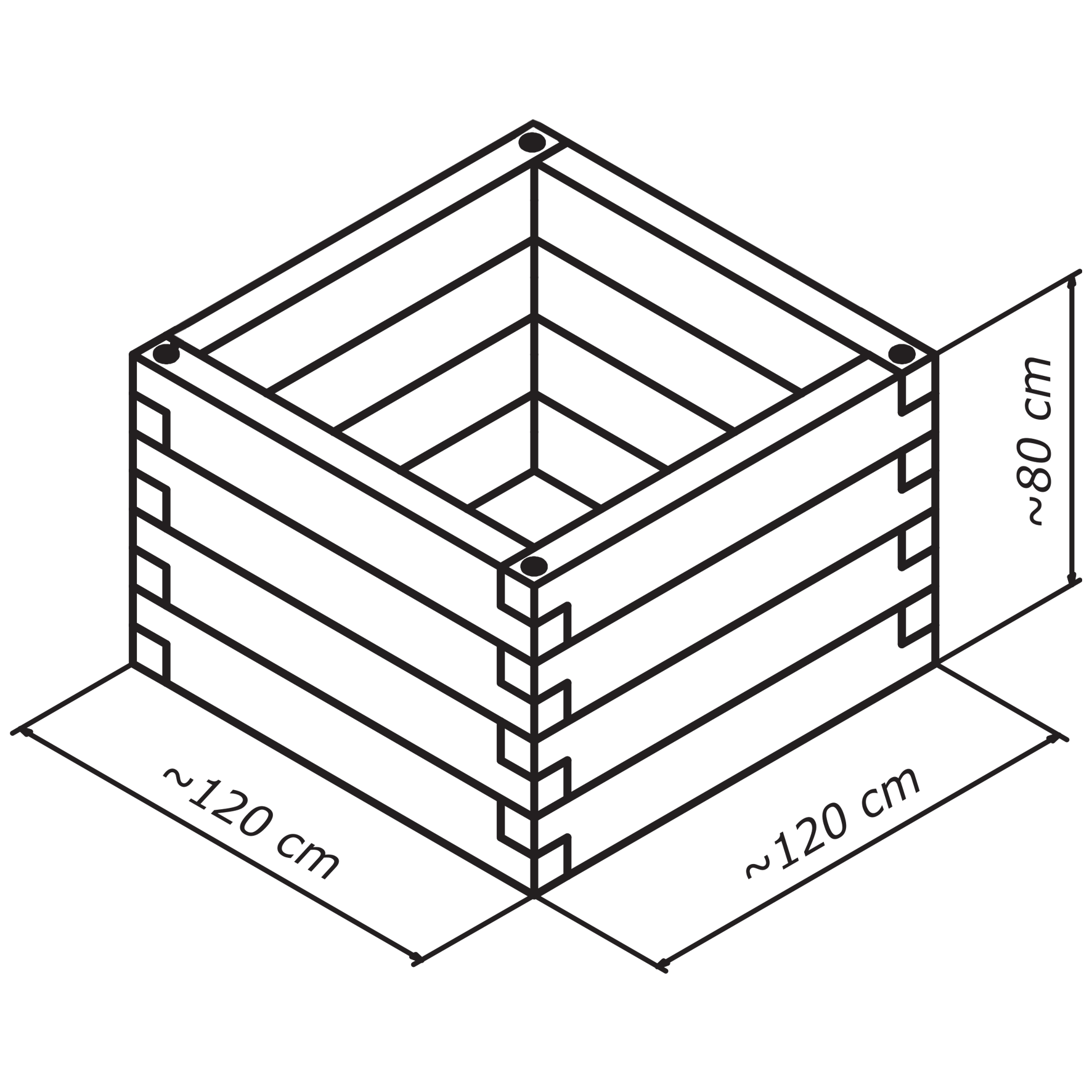 Das K-Form Hochbeet ist 1,20m lang /1,20 m breit und verfügt über eine 1,0 m² große Netto- Pflanzfläche. Es kann mit bis zu 0,8 m³ wachstumsfördernde Biomasse befüllt werden.