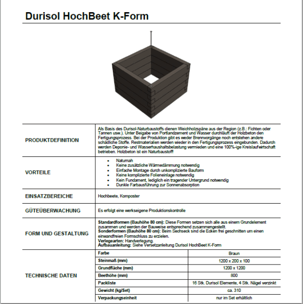 Das K-Form Hochbeet ist 1,20m lang /1,20 m breit und verfügt über eine 1,0 m² große Netto- Pflanzfläche. Es kann mit bis zu 0,8 m³ wachstumsfördernde Biomasse befüllt werden. Wer möchte, der kann das K-Form Hochbeet um das Frühbeet-Abdeckungsset erweitern und somit seine Pflanzsaison vorverlegen.